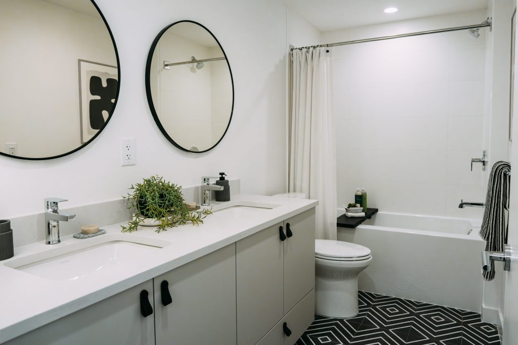 Relaxing spaces, geometric mosaic floor tiles, circular black-framed vanity mirrors with contemporary sconces.