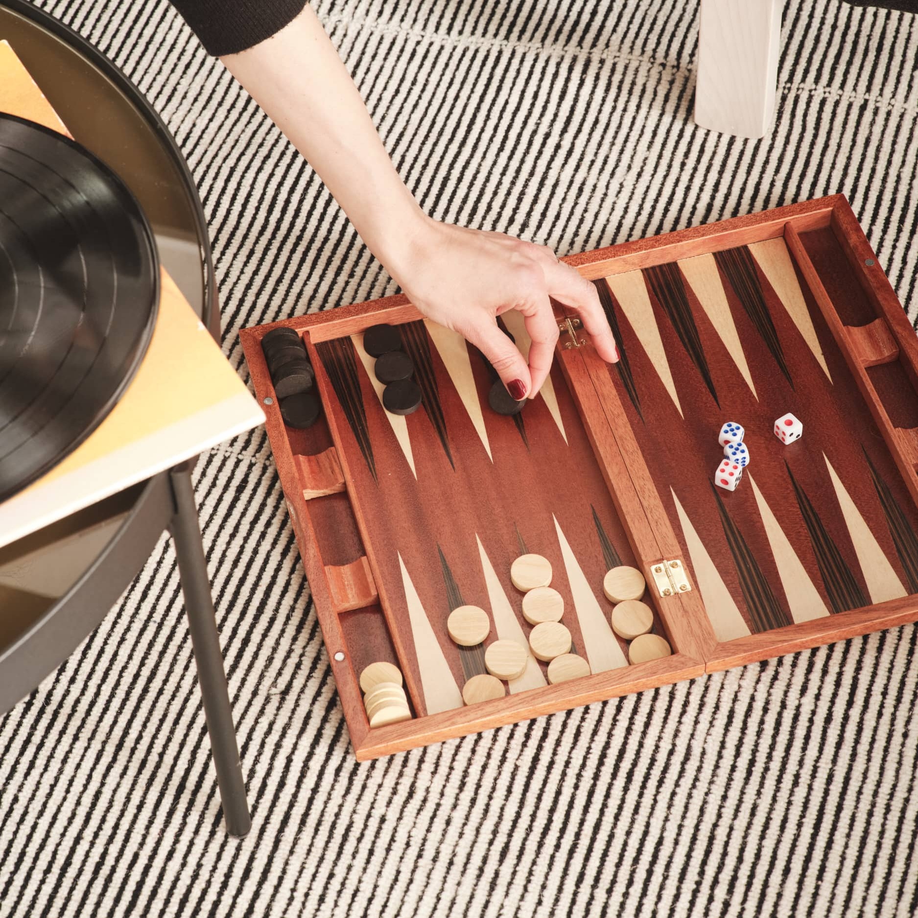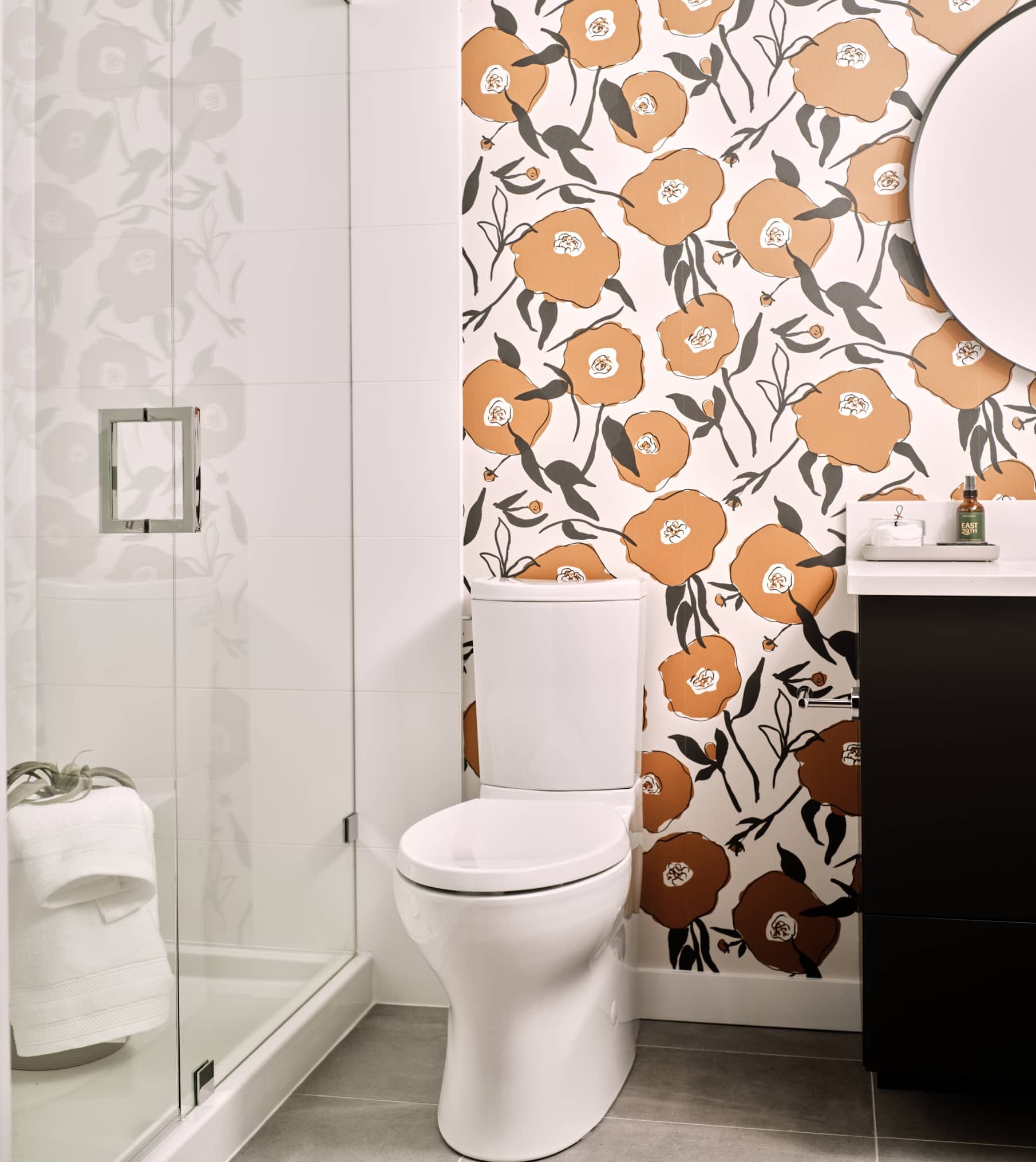 Relaxing spaces, geometric mosaic floor tiles, circular black-framed vanity mirrors with contemporary sconces.